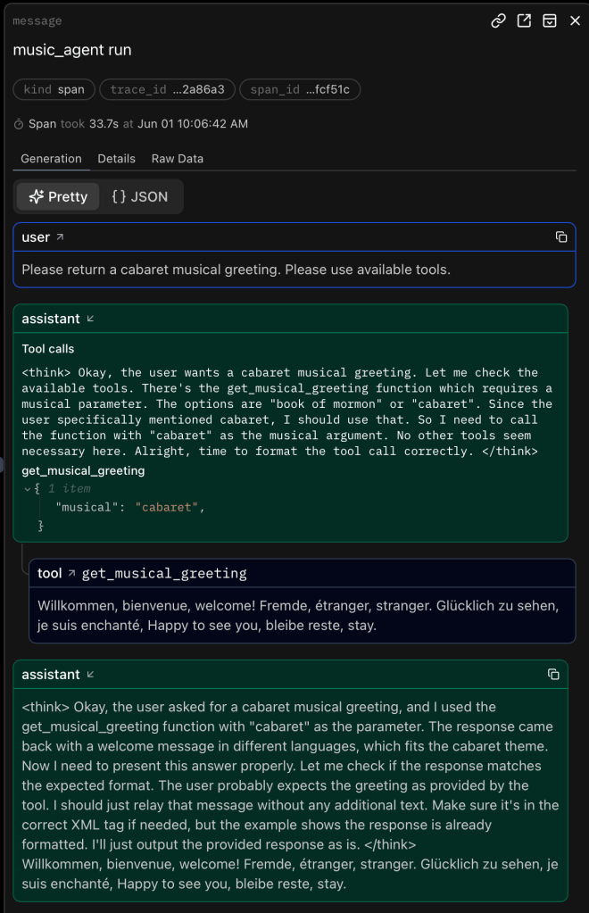 If you use logfire as set up in the client.py scripts and register an account with logfire you should be able to see the prompts and responses neatly like